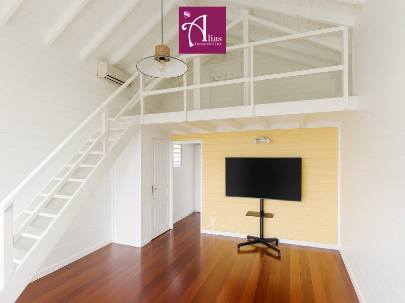 Un séjour avec mezzanine, une salle d’eau avec WC, et une terrasse
