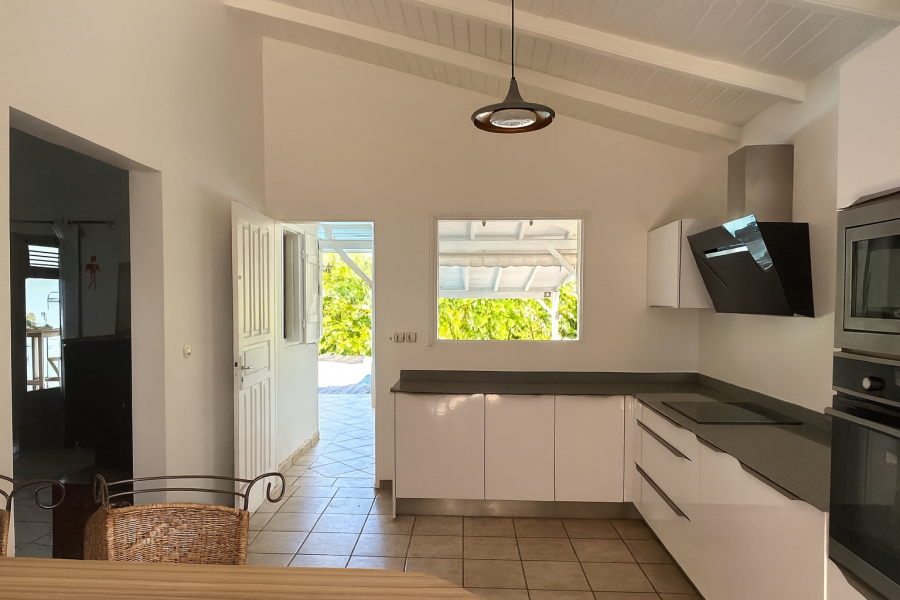Les espaces extérieurs sont pensés pour la détente et la convivialité : une terrasse couverte ouverte sur un deck, un carbet et une piscine au sel viennent compléter l’ensemble.